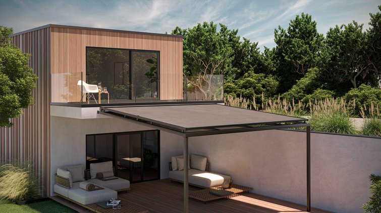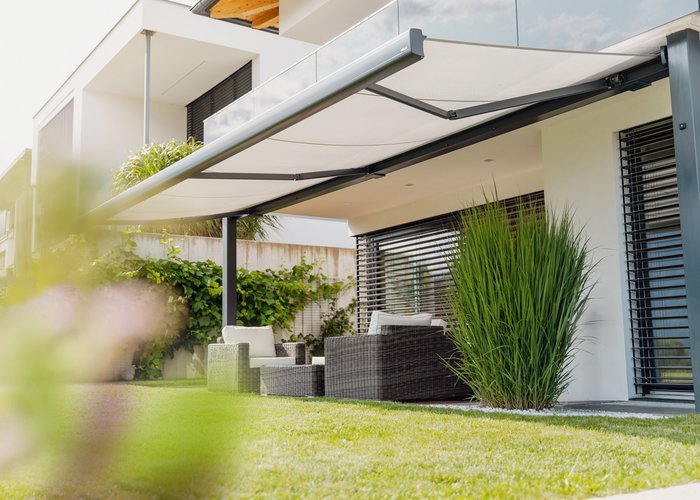 Für Terrassen eignen sich besonders Markisen, Auf- und Unterglasmarkisen sowie Senkrechtmarkisen, um direkte Sonneneinstrahlung zu reduzieren und Temperaturen angenehm zu halten. Die Systeme sind für den Außenbereich optimiert und daher sehr windstabil, langlebig und können mit weiteren Sensoren ausgestattet werden, um Komfort und Bedienung zu maximieren.